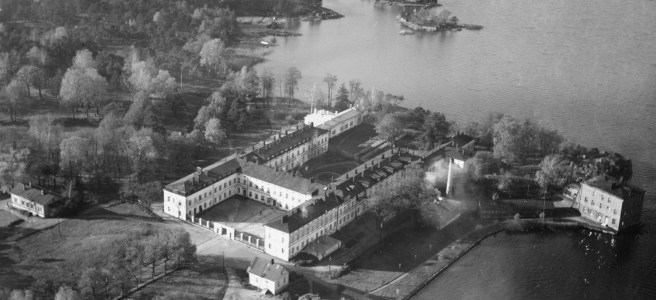 Kuva: Lapinlahden sairaala, Lapinniemi. Taustalla ylhäällä saaret: Sulhanen ja Morsian, Pikku Pässi ja Iso Pässi. Kuvaaja: Roos, R. (1930-1939). Helsingin kaupunginmuseo (CC BY 4.0).